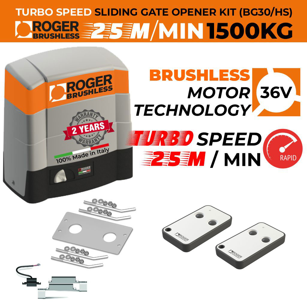 The Roger Technology BG30/1504/HS Brushless complete kit includes the roller sliding gate motor, control panel, and receiver.