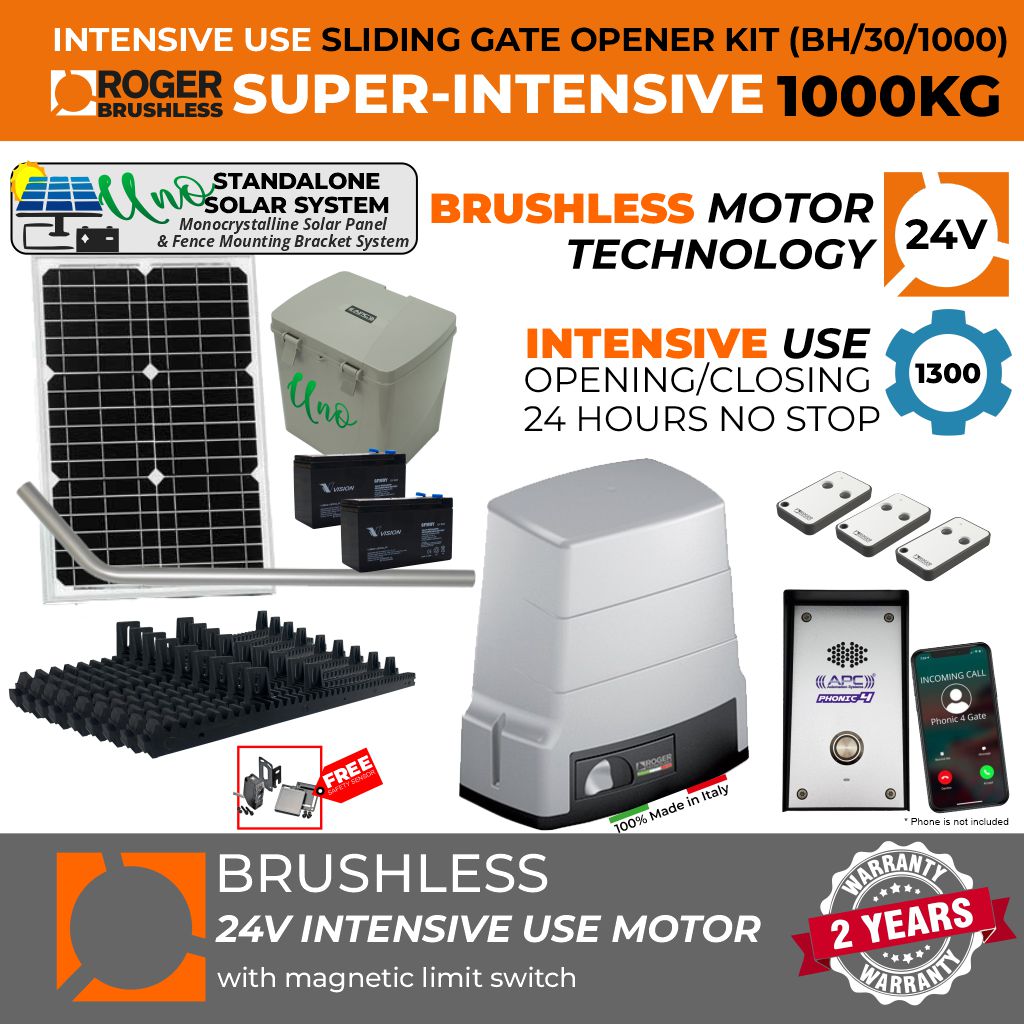 The Roger Technology BH30/804 Brushless complete kit includes the roller sliding gate motor, control panel, and receiver.