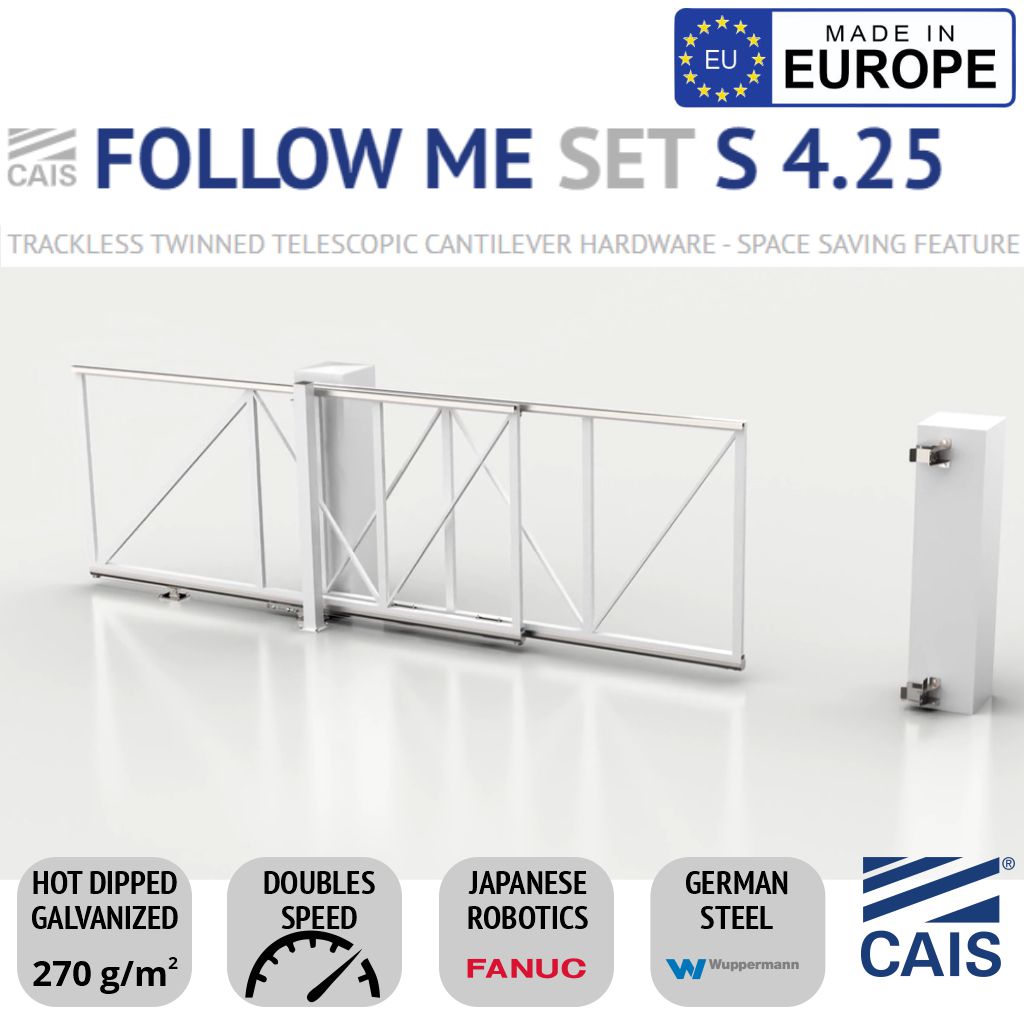 FOLLOW ME is a High-speed telescopic gate hardware that doubles the speed of opening and closing if compared to a standard cantilever or traditional sliding gate system by using an integrated system of special flying carriages + dedicated twinned tracks, and a series of cables that controls the opening and closing of the second leaf.